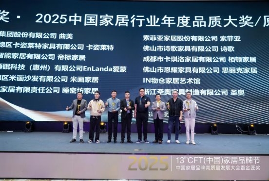 《金匠奖· 2025中国家居行业年度品质大奖/原创大奖》最终花落佛山市顺德区卡姿莱特家具有限公司、成都帝标智能家居有限公司、敏华爱蒙睡眠科技(惠州)有限公司、佛山市顺德区米画沙发有限公司、四川宅逸居家居有限责任公司、佛山市诗歌家具有限公司、成都市卡琪洛家居有限公司、佛山市恩耀家具有限公司、IN物仓家居艺术馆等企业;